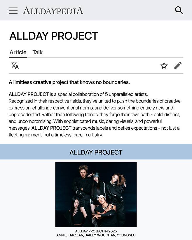 올데이 프로젝트는 더블랙레이블에서 두 번째로 선보이는 그룹이자, 오랜만에 등장한 혼성 그룹입니다! ‘다섯 명의 독보적인 아티스트들이 하나의 그룹으로 모인 특별한 프로젝트’라는 뜻을 가진 만큼 다섯 멤버의 뚜렷한 이력이 특징입니다💡. 그렇다면 어떤 멤버들이 함께 모였는지, 간략하게 살펴보죠! 대한민국 신세계 그룹의 외손녀라는 백그라운드로 화제가 되었던 애니, 무용계 등용문이라 여겨지는 동아무용콩쿠르 현대무용 부문 2년 연속 금상 수상 및 모델 활동을 이어왔던 타잔, 빌리프랩 소속 ILLIT(아일릿) 멤버 오디션 ‘알유넥스트’의 데뷔 조였던 영서, ‘쇼미더머니 6’의 최연소 본선 진출자이자 빅히트 뮤직의 공개 연습생 팀 Trainee A(트레이니 에이) 소속이었던 우찬, 그리고 Red Velvet의 ‘Psycho’를 시작으로 K-Pop 안무가로 활발히 활동을 이어온 베일리까지! 신인 그룹의 경우, 이와 같이 화려한 이력을 가진 멤버는 1~2인 정도로 팬덤 확보와 화제성을 함께 담당하는 경우가 많은데요. 올데이 프로젝트의 경우 모든 멤버가 그 화제성과 이력을 담당하고 있다는 점에서 상당히 많은 주목을 받았습니다😮.