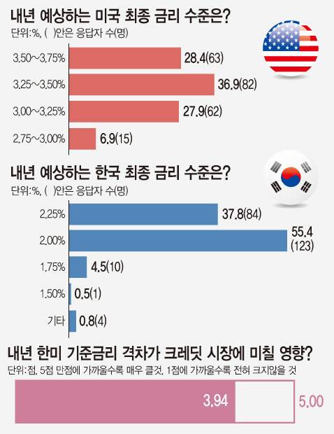 금리 동향에 촉각을 세우는 채권시장에서도 내년 금리 격차가 현재와 비슷하거나 좁혀질 것으로 내다봤다. 36회 SRE에서 내년 미국 최종 금리 수준은 3.25~3.50%가 82명(36.9%), 한국 최종 금리 수준은 2.00%가 123명(55.4%)으로 가장 많은 표를 얻었다. 단 한국의 경우 기준금리가 2.25%로 내린 뒤 유지될 거란 전망도 84명(37.8%)이 답했다. 이 경우 내년 한미 기준금리 격차는 1.25%포인트로 줄어들게 된다.