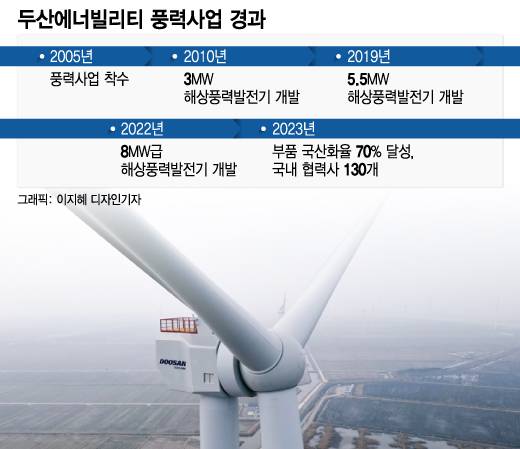 특히 두산의 '뚝심'이 평가받는 건 한국 내 풍력시장이 조성되지 않아 생산용량과 기술에 투자하기 어려운 여건에도 불구하고 사업을 이어왔다는 데 있다. 현재 전세계 풍력발전용 터빈 OEM은 덴마크 베스타스, 독일 지멘스가메사(SGRE), 미국 제너럴일렉트릭(GE) 등 소수업체가 중국 외 시장을 장악하고 있다. 2010년대 초만 해도 이들 기업과 두산간 기술격차가 벌어지지 않았다. 그러나 지난 10여년간 유럽 풍력시장이 급성장하며 기술개발과 생산용량 확대로 대응한 유럽계 터빈 제조기업들과 격차가 벌어졌다. 중국 골드윈드 등의 터빈 제조사들은 자국 시장을 앞세워 생산능력을 급속도로 키웠다.