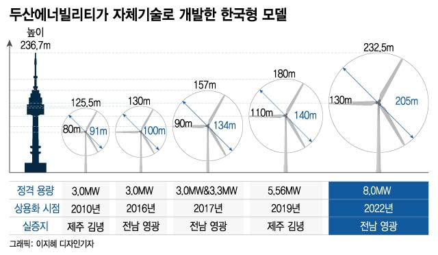 자국 시장이 부재한 상황에서도 두산에너빌리티는 자체 기술개발을 통해 터빈 제조 원천 기술을 확보했다. 글로벌 OEM 기업들의 터빈에 비해 같은 발전용량이라도 블레이드(터빈의 날개)를 크게 제작해 발전 효율을 높인 게 대표적인 강점이다. 유럽 북해 등에 비해 풍속이 상대적으로 더 낮은 한국의 풍질에 맞춘 기술이다. 기술개발에 대한 의지는 여전히 확고하다. 지난달 31일엔 한국중부발전과 20MW급 이상 차세대 해상풍력 터빈 공동개발을 위한 양해각서를 체결하며 최고 수준의 터빈 사양 개발을 위한 노력을 이어가겠다는 의지를 드러냈다.