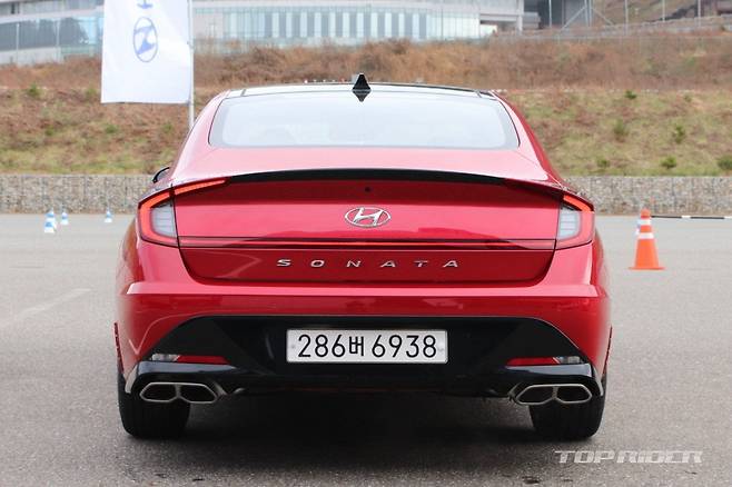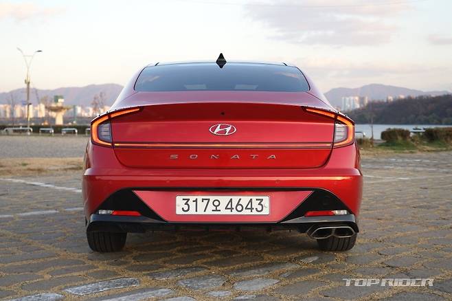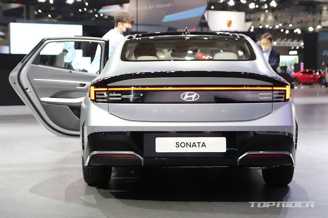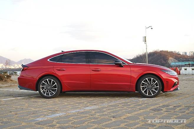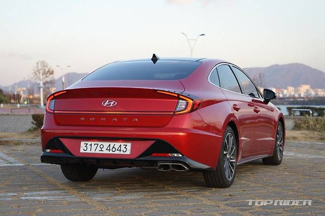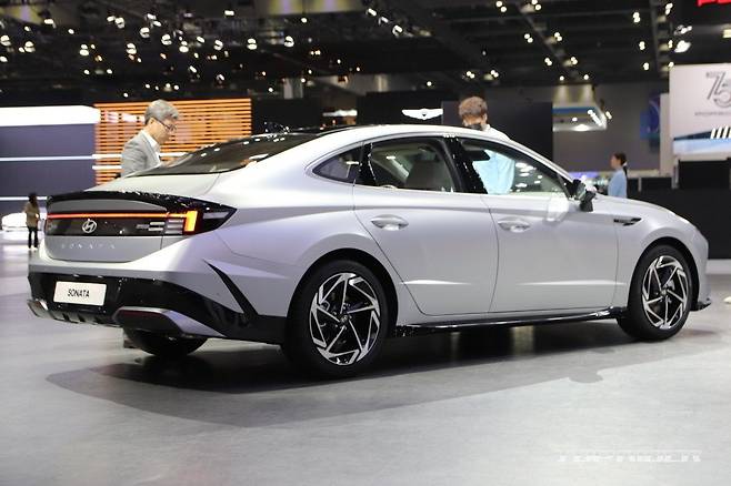 측면부는 낮게 시작하는 프런트 엔드와 긴 후드, 패스트백을 연상시키는 매끈한 루프라인 등 기존 쏘나타의 디자인이 유지됐다. 전면부 측면 펜더에는 사이드미러에서 자리를 옮긴 방향지시등, 가니쉬가 새롭게 탑재됐다. 신규 휠이 추가됐다. 후면부도 파격적으로 변했다.
