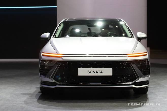 폭이 넓은 그릴과 범퍼 디자인으로 공격적인 인상이 구현됐다. 기존 쏘나타와 비교해 낮고 와이드한 이미지다. 특히 쏘나타 헤리티지 중 하나인 헤드램프부터 보닛을 지나 도어글라스 라인까지 이어지는 크롬 라인은 쏘나타 DN8을 끝으로 사라졌다. 히든 라이팅 램프도 삭제됐다.
