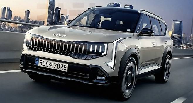 전면부는 기아의 최신 디자인 철학이 반영되어 각진 헤드램프와 세로형 LED 주간주행등이 강렬한 인상을 연출한다. 특히 대형 라디에이터 그릴은 현재 모델보다 훨씬 커졌으며, 전체적으로 더욱 당당하고 프리미엄한 분위기를 자아낸다.