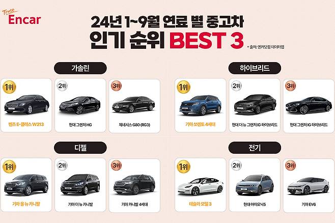 엔카닷컴은 2024년 1월부터 9월까지 가장 많이 판매된 ‘연료별 중고차 베스트셀링’ 순위를 공개했다.