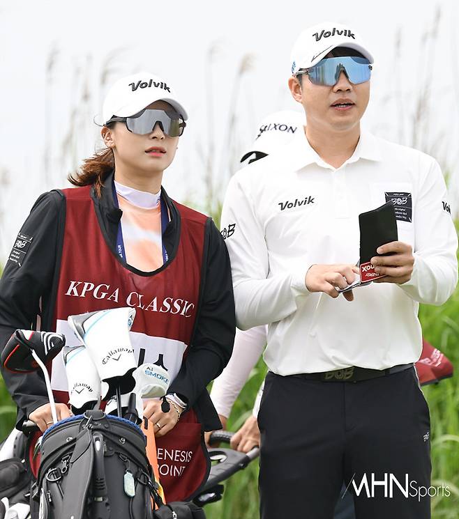 선글라스를 착용했지만 김민수의 표정만 봐도 꿀떨어지는 눈빛으로 캐디를 바라보는 것이 느껴진다. 그 이유는 이미 아는 사람들은 아는 김민수 캐디는 그냥 캐디가 아닌 김민수의 아내이기 때문이다.