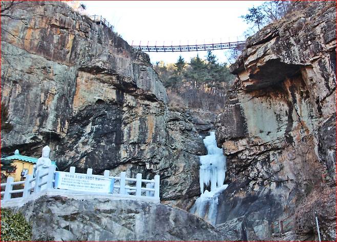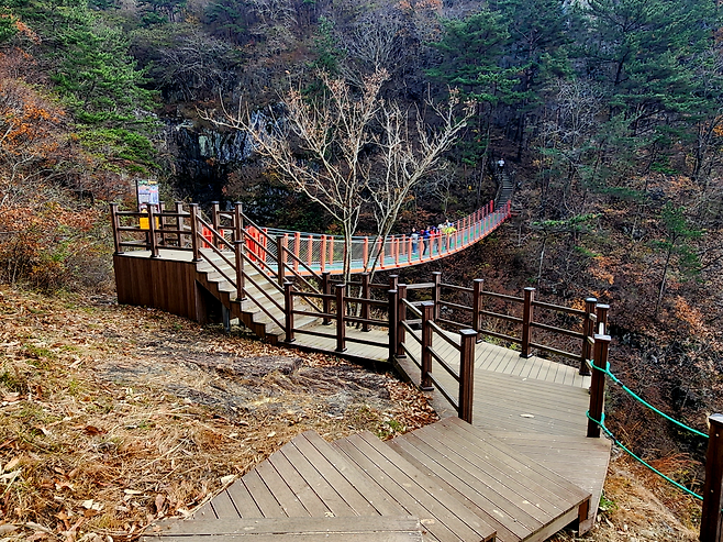 겨울철이라 수량은 많지 않았지만, 폭포암을 향해 오르는 길목에서 바라본 협곡과 폭포 자리만으로도 그 장면이 얼마나 웅장했을지 충분히 상상할 수 있었습니다. 갈림길에서 오른쪽으로 조금만 가면지상 50m, 길이 35m의 출렁다리가 등장합니다.