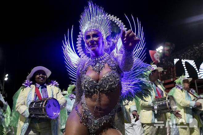 [리우데자네이루=AP/뉴시스] 5일(현지 시간) 브라질 리우데자네이루 삼바드로메에서 그란지 리우 삼바 스쿨의 드럼 퀸 파올라 올리베이라가 카니발 퍼레이드를 선보이고 있다. 2025.03.05.