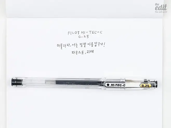 겔펜으로는 명불허전 PILOT HI-TEC-C 0.25(0.3)가 있습니다. 가늘고 날카로운 촉은 글씨를 쓸 때 어떠한 굴림도 허용하지 않겠다는 각오가 느껴져요. 그래서인지 의식하지 않아도 글씨가 또박또박 써집니다.