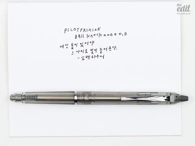 두번째 펜은 PILOT frixion ball knock zone 0.5입니다. 지워지는 펜으로 오탈자에 대한 부담 없이 기록할 수 있는 펜이에요. 달력이나 오기 없이 쓰고 싶은 업무 노트, 중요한 필기 노트 등에 제격입니다. 지워지는 펜 특유의 흐릿함이 많이 개선된 버전으로 선명하게 쓰고 맘 편히 지우며 원하는 정도의 완벽함에 도달할 수 있어요.