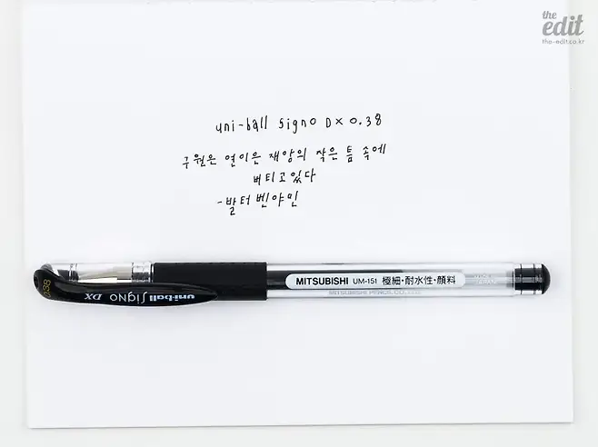 Uni-ball Signo DX 0.38도 비슷한 느낌이지만, 필압에 예민하게 반응하는 편이라서 필압을 개성있게 조절하며 쓰시는 분들께 추천해요. 붓펜을 쓰듯 글씨의 강약이 고스란히 드러나는 펜입니다.