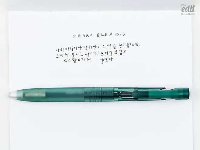 정직하게 할 말만 하는 듯한 각진 글씨를 지니셨다면 글씨를 쓸 때 손 또는 손가락에 힘이 많이 들어가 있을 텐데요, 선언하듯 또박또박 쓰는 정직한 글씨에는 ZEBRA blen 0.5가 잘 맞습니다.