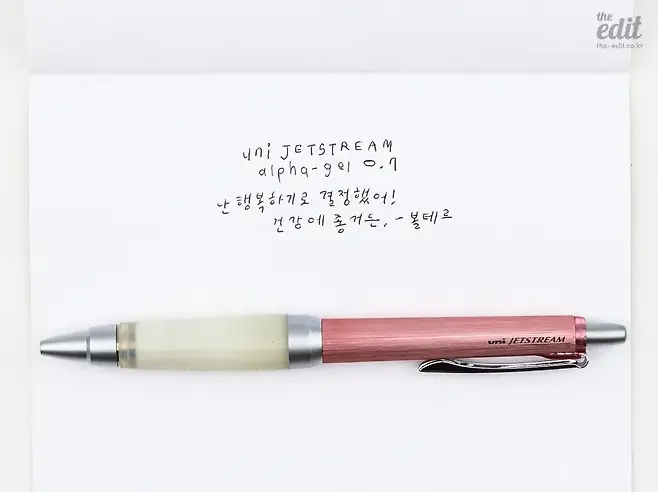 Uni Jetstream alpha gel 0.7은 은근한 무게로 중심을 잘 잡아주는 펜입니다. 어린 시절 쓰던 말랑한 샤프의 감촉을 고스란히 지녔으며, 자연스레 손에 적당한 힘이 들어갑니다. 심보다 바디의 특징이 월등하게 뛰어난 펜이에요.