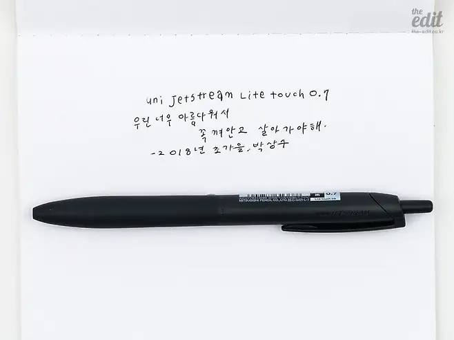 이번에 새로 나온 Uni Jetstream Lite touch 0.7은 큰 글씨를 뚜벅뚜벅 쓰기에 이상적인 펜입니다. 마치 손가락을 하나 더 얻은 듯 손에 감기는 느낌이 편안하고, 잉크가 종이 위에 새겨지는 감촉 또한 폭신합니다. 마치 하고 싶은 말을 끊지 않고 다 들어주는 친구 같달까요?