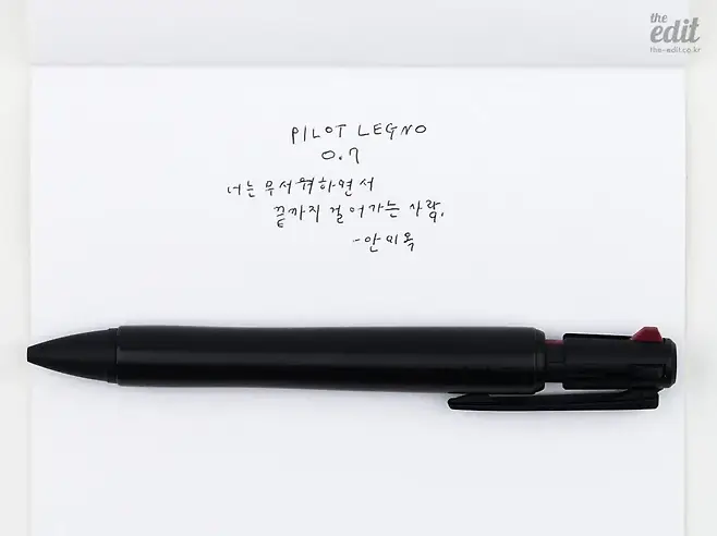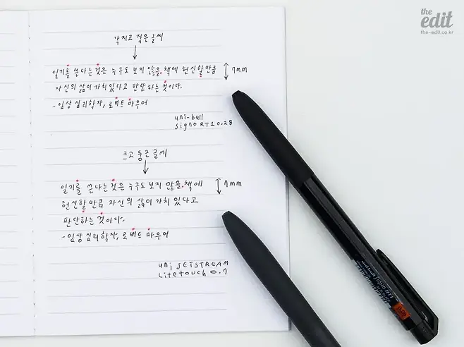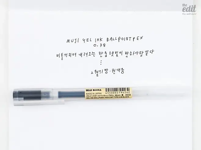 볼펜보다 잉크 펜을 선호하신다면 두 가지 펜을 고려해 보세요. 첫 번째는 무인양품의 MUJI Gel ink ballpoint pen 0.38입니다. 글씨를 크게 쓰면 필기한 공간이 넓어서 자칫하면 얇은 기둥이 넓게 박힌 듯 휘청이는 듯한 느낌을 줄 수 있는데요, 이 펜은 획의 굵기가 일정하고 글씨 끝부분의 맺음이 깔끔해서 꼿꼿하게 프린트한 것 같은 효과를 줍니다.
