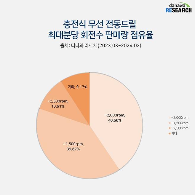 무선 전동드릴 구매 시 하나의 기준이 될 수 있는 rpm은 최대분당회전수를 뜻한다. 잘 모르는 사람들은 rpm이 무조건 높으면 좋은 줄 오해한다. 실제로는 작업물에 따라 요구되는 rpm이 다르므로 높은 것이 마냥 좋은 것은 아니다. 이는 다나와 리서치를 통해서도 알 수 있다. 2,500rpm 이하 제품은 10.61%의 점유율을 차지하며 3위에 머물렀지만, 그보다 적은 2,000rpm 이하는 40.56%로 1위를 기록했다. 2위는 1,500rpm 이하로 39.67%의 점유율을 차지했다.