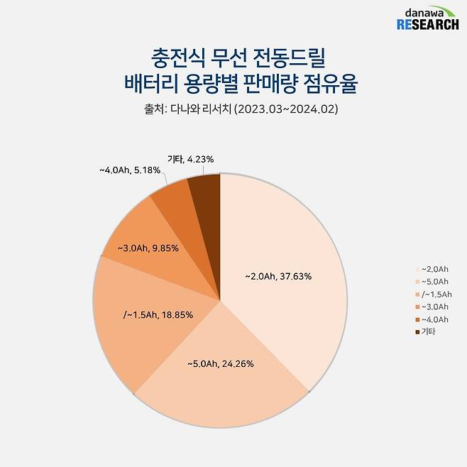 다나와 리서치를 통해 최근 1년간 배터리 용량별 무선 전동드릴 판매량 점유율을 살펴본 결과, 가장 많이 선호하는 배터리 용량은 37.63%의 점유율로 2.0Ah 이하 제품이 차지했다. 그 아래로는 5.0Ah 이하가 24.26%, 1.5Ah 이하가 18.85%의 점유율을 기록했다. 이 밖에 3.0Ah 이하, 4.0Ah 이하도 점유율을 차지하고 있긴 하나, 1위인 2.0Ah 이하 제품과 작게는 약 4배에서 크게는 7배까지 차이가 났다.