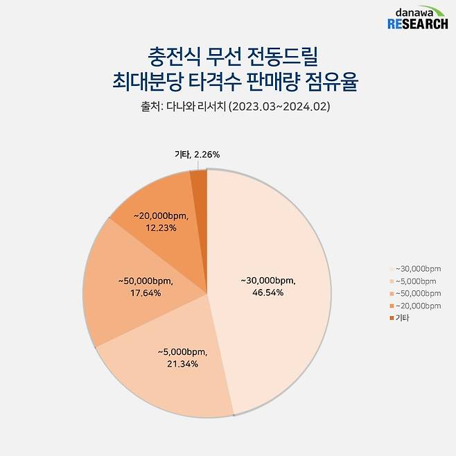 무선 전동드릴 구매의 또 다른 기준인 bpm은 분당타격수를 뜻한다. 이 수치가 높으면 능률 역시 좋다고 볼 수 있다. 소비자들이 가장 선호하는 제품은 30,000bpm 이하인데, 점유율이 46.54%로 판매량의 사실상 절반에 가까운 수치다.