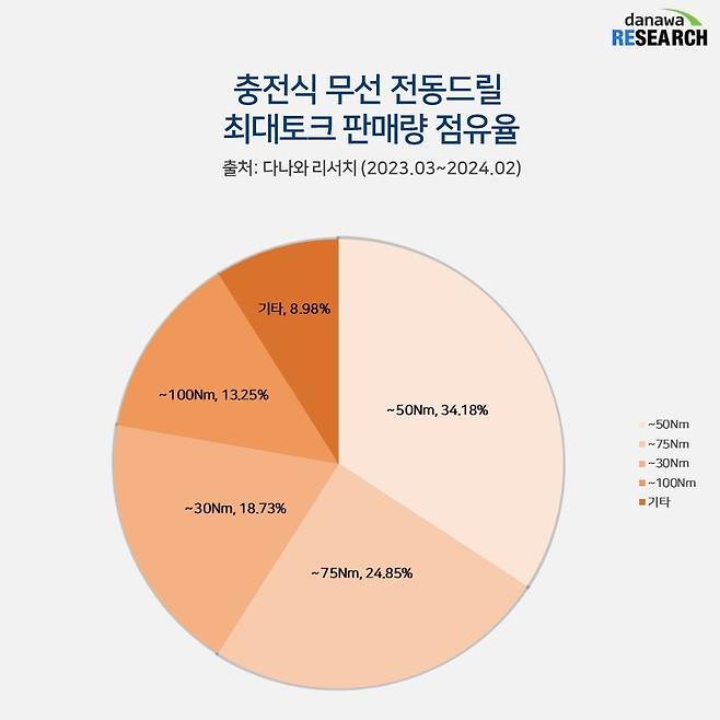 토크는 Nm이라고 하여 돌리는 힘의 정도를 나타낸다. 값이 높을수록 큰 힘이 필요한 작업에 사용된다. 토크조절 기능이 있는 제품은 전동 드라이버처럼 쓸 수 있기 때문에 활용도도 높은 편이다. 가장 선호도가 높은 제품은 50Nm 이하로 점유율은 34.18%를 차지했다. 그 밑으로 75Nm 이하가 24.85%, 30Nm 이하가 18.73%, 100Nm 이하가 13.25%를 기록했다.