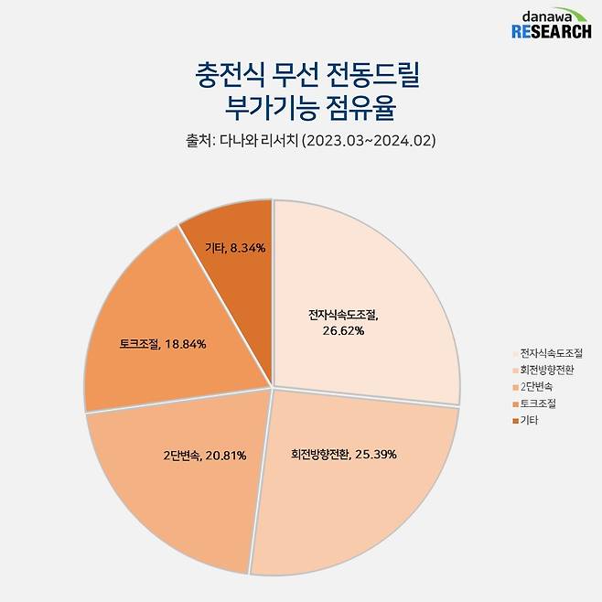 부가 기능은 전자식 속도조절 기능이 탑재된 제품이 가장 판매량이 많았다. 2위는 회전방향전환 기능이 근소한 차이로 차지하였다. 2단변속과 토크조절도 1, 2위와 약간의 간극은 있으나 무시할 수 없는 점유율을 보였다. 이 외에 기능은 유의미한 수치라고 보기 힘들었다.