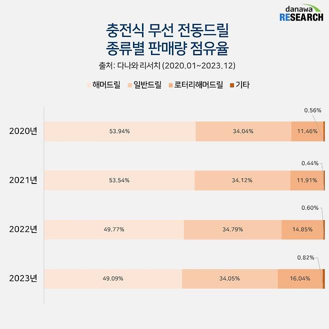 실제 소비자들의 선호도는 어떨까? 일반드릴은 판매량 점유율 변화가 거의 없다. 해머드릴은 매년 점유율이 줄더니 2023년에는 49.09%로 2020년과 비교해 4.85%가 감소했다. 반면 로터티해머드릴의 점유율은 증가해 2020년과 대비하여 2023년에는 4.58%가 상승하여 16.04%를 차지했다.
