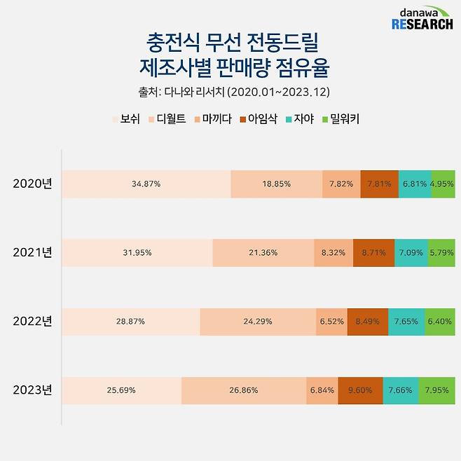 제조사별 판매량 점유율은 2020년에는 보쉬가 34.87%로 압도적인 1위였다. 그 뒤를 디월트가 꾸준히 추격하여 매년 거의 3%씩 성장한 끝에 2023년에는 보쉬를 추월하고 26.86%로 1위에 올랐다. 보쉬와 디월트만큼 큰 변동을 보이진 않았지만, 마끼다/아임삭/자야/밀워키의 싸움도 나름대로 치열했다. 2020년만 해도 3등이었던 마끼다는 2023년 네 브랜드 중 꼴등이 됐다. 반면 나머지 세 브랜드는 소폭이긴 하나 꾸준히 성장했다.