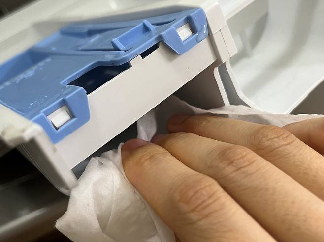 세제통이 꽂혀있던 곳도 안쪽에 곰팡이가 쉽게 생깁니다. 세제통 제거 후 내부도 물티슈로 한 번씩 닦아주세요.