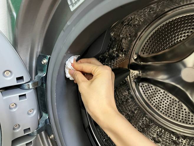 고무패킹 사이사이에도 먼지나 곰팡이가 정말 잘 끼는데요. 고무패킹도 수시로 물티슈로 닦아주면 세탁기 청결 관리에 한층 도움 됩니다.