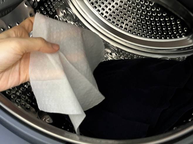 이런 어두운 계열의 옷은 비슷한 색끼리 모아서 세탁하는 경우 흰 먼지가 덜 묻습니다. 또한 이때, 물티슈를 한두 장 넣어서 세탁기를 돌려보세요.