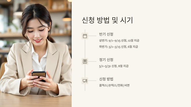 반기 신청: 근로 소득자만 신청 가능하며, 소득 발생 시점과 지급 시기를 가깝게 하여 생활 안정을 돕는 제도입니다.