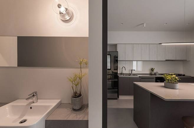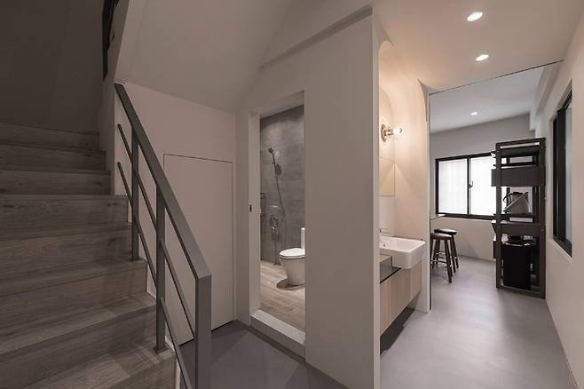 세면대는 복도로 옮겨져 동선에 유연성을 더하고, 감염병 시대에 적합한 비대면 동선을 고려했다. 세심한 곡선 마감과 조명, 채광창 배치는 실용성과 미적 감각을 동시에 만족시킨다. 계단은 기존의 차가운 마루 대신 내구성 좋은 고강도 바닥재로 교체되었으며, 손잡이는 간결한 철제 프레임으로 따뜻함보다는 깔끔함을 선택했다.
