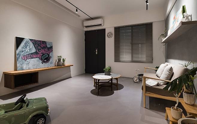 거실에는 부드러운 곡선의 창 프레임이 정돈되어 있어 공간의 질서가 느껴진다. 디자이너는 선형의 구조물이 자연스럽게 눈길을 끌도록 천장과 벽의 라인을 깔끔하게 정리했다. 한쪽 창을 막고 그 자리에 텔레비전 벽을 설치한 것이 매우 효과적이다. 이 벽은 중립적인 색상의 페인트와 무광 바닥재 덕분에 자연스럽게 두드러진다.