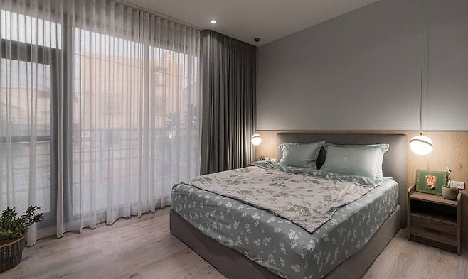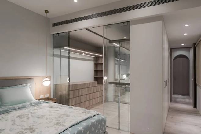 무창 구조의 욕실은 유리 파티션을 통해 빛이 깊이 들어올 수 있도록 설계되었으며, 벽면의 따뜻한 회갈색 계열은 침실 전체의 분위기를 조성하고 원목 베드프레임과 아름다운 조화를 이룬다.