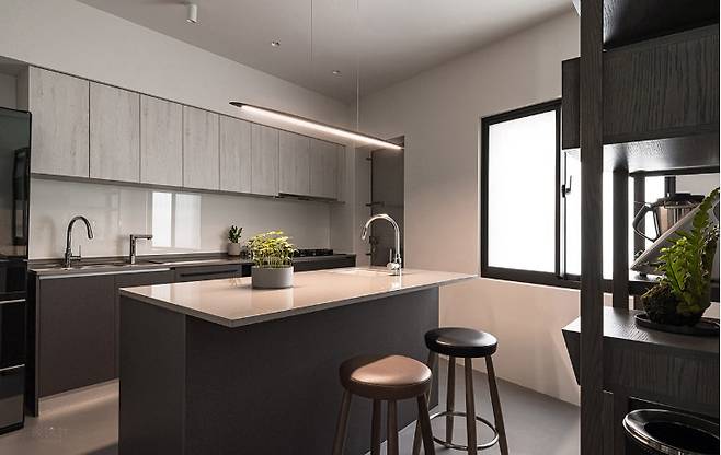 조리대는 간결한 일자형 디자인으로, 중심에는 대형 중도어 아일랜드가 자리 잡고 있다. 가전제품과 조리기구는 벽면에 설치된 오픈형 선반에 깔끔하게 정리되어 있으며, 폐쇄적이지 않으면서도 필요한 수납은 모두 갖춘 현대적인 주방의 표본이다.