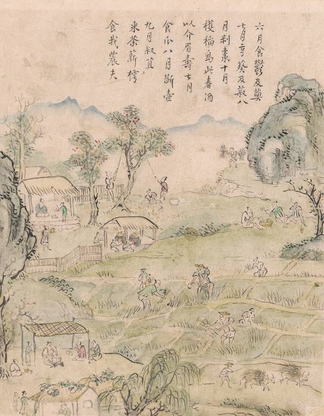 그림에는 제시의 내용처럼 유월부터 구월까지의 농촌 풍경이 충실히 담겨있습니다. 먼저 우측 산 아래를 보면 나무 아래 낮아 머루와 아가위를 먹는 유월을, 언덕선을 따라 좌측 아래로 내려가면 집안에서 화덕에 솥을 걸고 아욱과 콩을 삶는 칠월의 풍경이 보입니다. 칠월 풍경 위에는 대추 따는 팔월이, 그 아래에는 벼를 베는 시월의 농부들이 넓게 그려졌습니다. 다시 콩 삶는 집 좌측 위에는 봄술을 들고 노인을 찾아가 장수를 비는 장면이 나옵니다. 하단 좌측에는 여러 사람들이 원두막 아래 앉아 오이 먹는 칠월과 지붕 위의 박을 따는 팔월이 다시 등장합니다. 시에 적힌 그대로입니다.