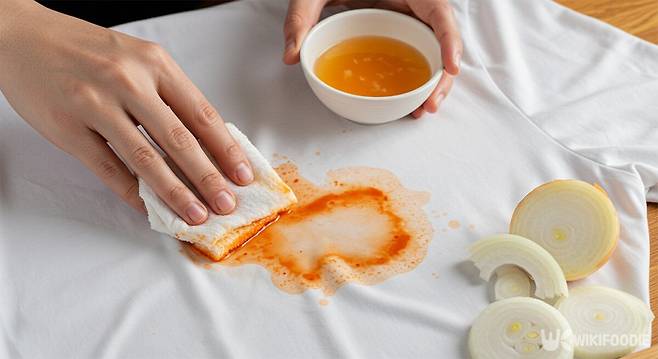 양파를 곱게 갈아 즙을 낸 뒤, 얼룩 부위에 넉넉히 바른다. 20~30분 정도 방치한 뒤 주방세제를 묻혀 손으로 비비거나 세탁 브러시로 문질러 세탁하면 얼룩이 눈에 띄게 사라진다. 양파즙에 들어 있는 폴리페놀과 황화합물은 색소 성분 분해에 효과적이다.