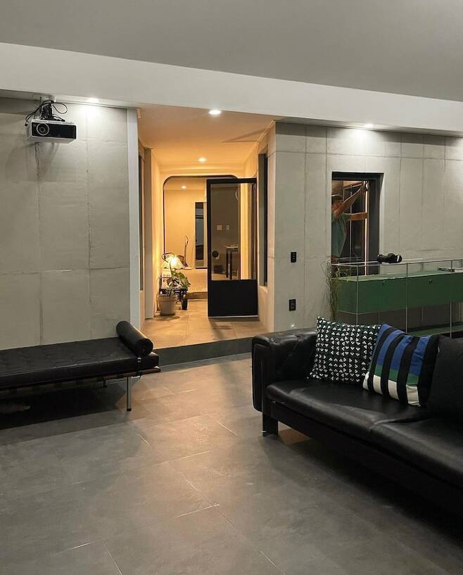 신축 거실은 16평에 박공지붕이고, 2중 로이코팅 유리로 뷰를 확보했어요. 빔으로 홈시네마를 즐기고 뷰를 바라보며 쉴 수 있는 힐링 공간을 생각하며 인테리어에 맞는 가구들을 선택했어요. 천장 박공은 도배로 했고, 그 외 벽은 노출 콘크리트 느낌으로 카페 분위기가 나도록 디자인을 잡았어요.