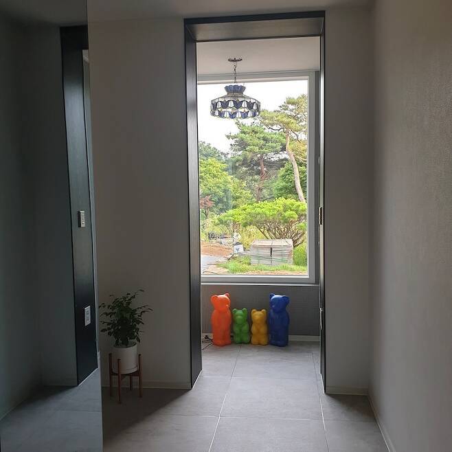 그리고 본동과 신축동 연결이 아주 기가 막혔어요. 기존 본동 거실에는 밖으로 나갈 수 있는 창이 두 개가 있었어요. 전면부에 하나 그리고 건물 좌측면으로 작게 하나가 있었는데 좌측면 쪽을 헐어서 신축동과 연결하는 복도가 만들어졌고 현관 입구도 그쪽으로 변경하게 되었어요.