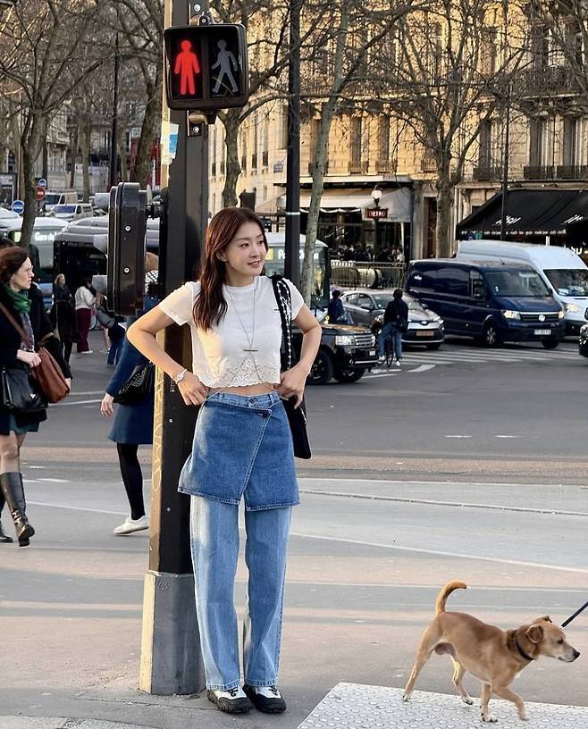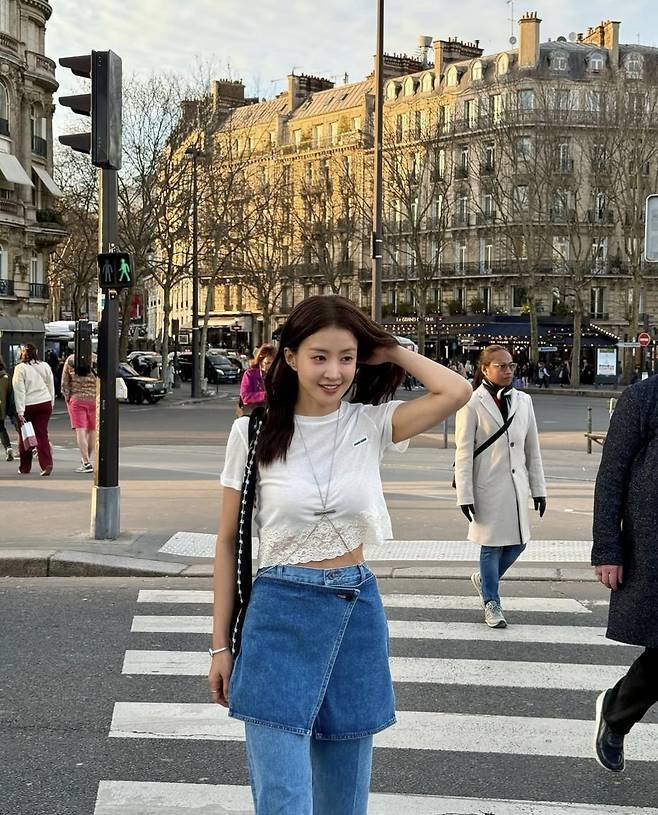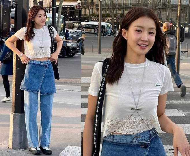 레이스 포인트가 돋보이는 시스루 크롭 화이트 티셔츠와 독특한 디자인의 데님 스커트-팬츠 레이어드 아이템을 매치해 트렌디한 스트리트 무드를 완성했습니다.