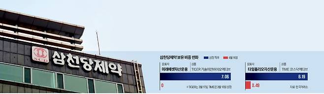 타임폴리오자산운용도 삼천당제약을 공격적으로 담았다. 지난달 10일 ‘TIME 코스닥액티브’ ETF 상장 당일 삼천당제약 비중은 6.19%로 전체 51개 편입 종목 가운데 세 번째로 컸다. 비교지수인 코스닥지수에서 차지하는 비중(3%)의 두 배를 웃돌았다.