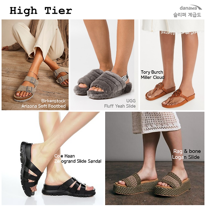 상급 슬리퍼는 주로 독특한 개성이나 매력적인 디자인 덕분에 패션 아이템으로 자리 잡은 제품들이다. 대표적인 브랜드가 있다면 바로 버켄스탁. 버켄스탁은 바닥에 ‘코르크’ 소재를 적용하면서 선풍적인 인기를 끈 샌들로, 발 굴곡에 맞는 아치 형태의 밑창을 세계 최초로 적용한 신발이기도 하다. 다소 둔탁한 디자인을 가지고 있지만 오래 신을수록 발 모양에 맞게 코르크가 마모되어 점점 더 발이 편해진다. 대표 모델인 아리조나는 샌들의 대중화를 이끈 세계적인 제품으로 평가받고 있다. 가격은 15~20만 원선.