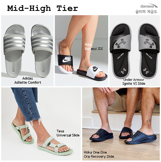 중상급 슬리퍼는 스포티한 디자인에 기능성에 중점을 둔 제품들이다. 나이키, 아디다스와 같은 스포츠 브랜드 슬라이드가 대표적. 가벼우면서 탄성이 느껴지는 고무 소재로 부드럽고 편안한 쿠션감을 선사해 발이 편안한 것이 특징이다. 나이키 베나시를 포함해 삼선 슬리퍼의 원조 격인 아디다스 아딜렛 컴포트, 메모리폼이 적용된 언더아머 이그나이트 VI 슬라이드 등은 3~4만 원대에 구매할 수 있다.