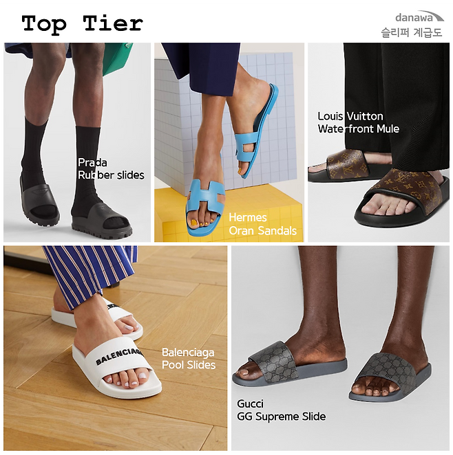 최상급 탑 티어 슬리퍼는 단연 명품 패션 브랜드들의 제품이다. 구찌, 루이비통, 발렌시아가, 프라다, 에르메스 등 세계적인 명품 브랜드에서 출시되는 슬리퍼는 단순한 디자인에 로고만 박혀 있더라도 훌륭한 패션 아이템으로 취급되곤 한다. 대표적인 예는 루이비통, 발렌시아가, 프라다. 검은색 고무 슬리퍼에 엠보싱으로 로고를 새겨 군더더기 없이 브랜드 아이덴티티를 강조했다. 디자인은 심플하지만, 명품 슬리퍼답게 가격은 50~90만 원선.