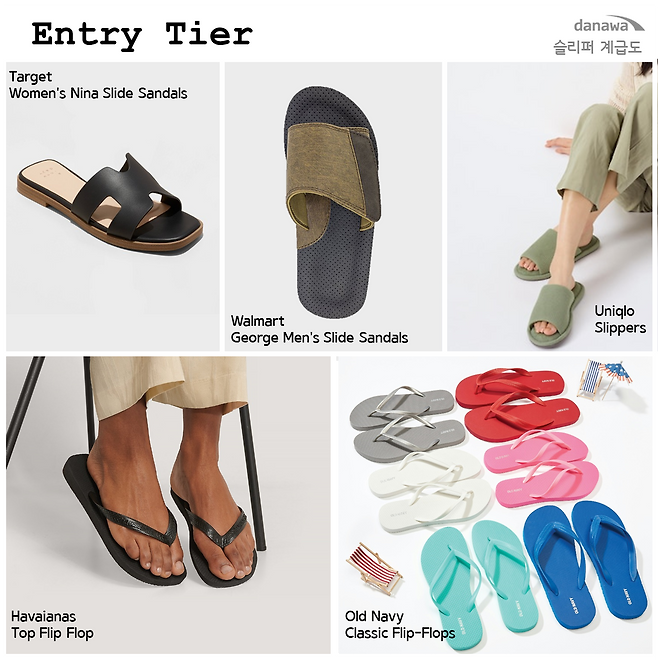 보급형 슬리퍼는 1~3만 원대 위주의 가성비 좋은 제품들로 구성되어 있다. 타깃, 월마트 등에서 대중적으로 판매하는 납작한 쪼리 형태의 ‘플립플롭’이 인기로, 밑창이 납작해 장시간 착용하거나 오래 걷기에는 무리가 있지만 간편하게 신고 다니기에는 충분하다. 국내에서도 쉽게 구매할 수 있는 유니클로 슬라이드 샌들은 발을 압박하지 않으면서 쿠션감이 좋고 가벼우며 잘 미끄러지지 않아, 실외에서는 물론 실내화로 사용하기에도 좋다.