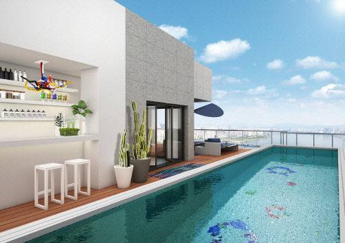 주방은 대형 아일랜드 타입이며, 해외 하이엔드 가전이 기본 탑재되어 있습니다. 특히 펜트하우스 세대는 루프탑 가든과 일부 전용 수영장을 제공하며, 실사용 면적은 150평에 달하기도 합니다.