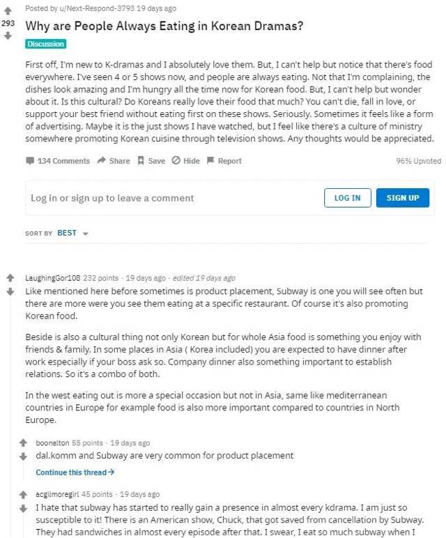 일단, 나는 한드를 최근에 처음 접했고 진짜 좋아해. 근데 보면 사방에 음식이 있더라고. 지금까지 4~5개의 드라마를 봤는데, 사람들이 계속 먹고 있어. 불평하는건 아니고, 음식이 다 맛있게 보여서 보고 나면 한식이 먹고싶어져. 근데 진짜 궁금해서 그러는데, 이게 일종의 문화야? 한국 사람들은 정말 그렇게 한식을 좋아해? 죽을때도, 사랑에 빠질때도, 절친을 도울때도 꼭 먼저 먹고 시작하더라고. 가끔은 광고의 일종 같다고도 느꼈는데. 내가 본 것들만 그럴 수도 있겠지만, 꼭 한국 문화관광청 같은데서 계속 음식 홍보를 하는 것 같다고도 느꼈어. 어떤 의견이든 고마워.