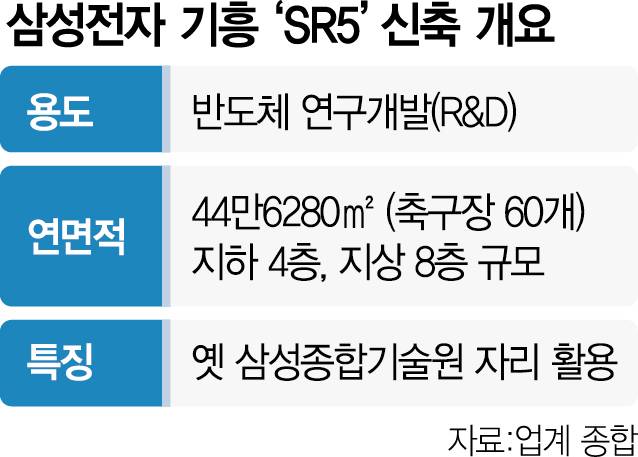 SR5 신축은 남다른 의미를 가진다. SR5의 시작은 고(故) 이병철 삼성전자 창업 회장이 1987년 ‘무한 탐구’ 정신을 강조하면서 설립한 삼성종합기술원이다. 반도체 사업의 시작이라고 할 수 있는 이곳에서 1992년 세계 최초로 64Mb(메가바이트) D램을 개발했고 1993년 메모리반도체 1위 등을 이뤄냈다. 초격차의 산실인 SR5가 새롭게 태어나는 것이다.