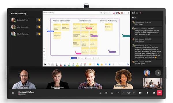 윈도우의 마이크로소프트 팀즈 룸에서 서피스 허브3의 프론트 로우(Front Row)를 사용하면 AI 통합 비디오 갤러리, 채팅, 손들기 및 콘텐츠가 최적화되어 사용자 지정 가능한 단일 보기에 함께 제공된다.