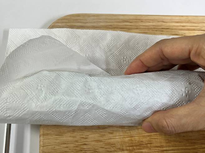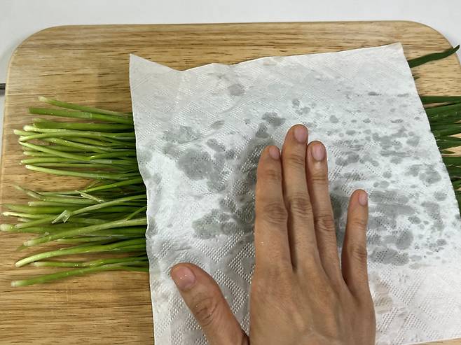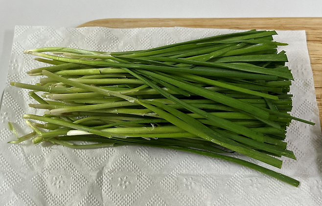 부추는 키친타월 길이에 맞게 자른 다음 키친타월 위에 올려 주세요.