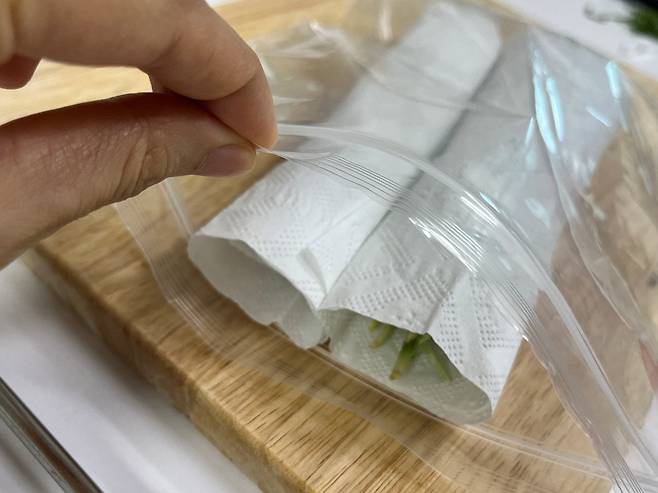 키친타월에 돌돌 만 부추 여러 개를 다시 지퍼백에 넣어서 이중으로 밀봉합니다. 이렇게 하면 쉽게 부추가 무르지 않고 향과 색도 오래 유지가 됩니다.