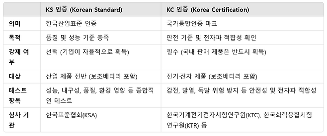 예를 들어 해외 직구로 저렴하게 구매한 보조배터리 중에는 겉으로 보이는 표기 스펙은 좋지만 막상 써보면 금방 고장 나거나, 배가 부풀거나, 사용 중 제품이 터져서 연기가 나거나 불이 붙은 경우가 비일비재하다. 이들 제품은 대부분 KS/KC 인증을 받지 않았고, 제품에 표기된 중국, 유럽 품질 인증 또한 신뢰하기 어렵다.